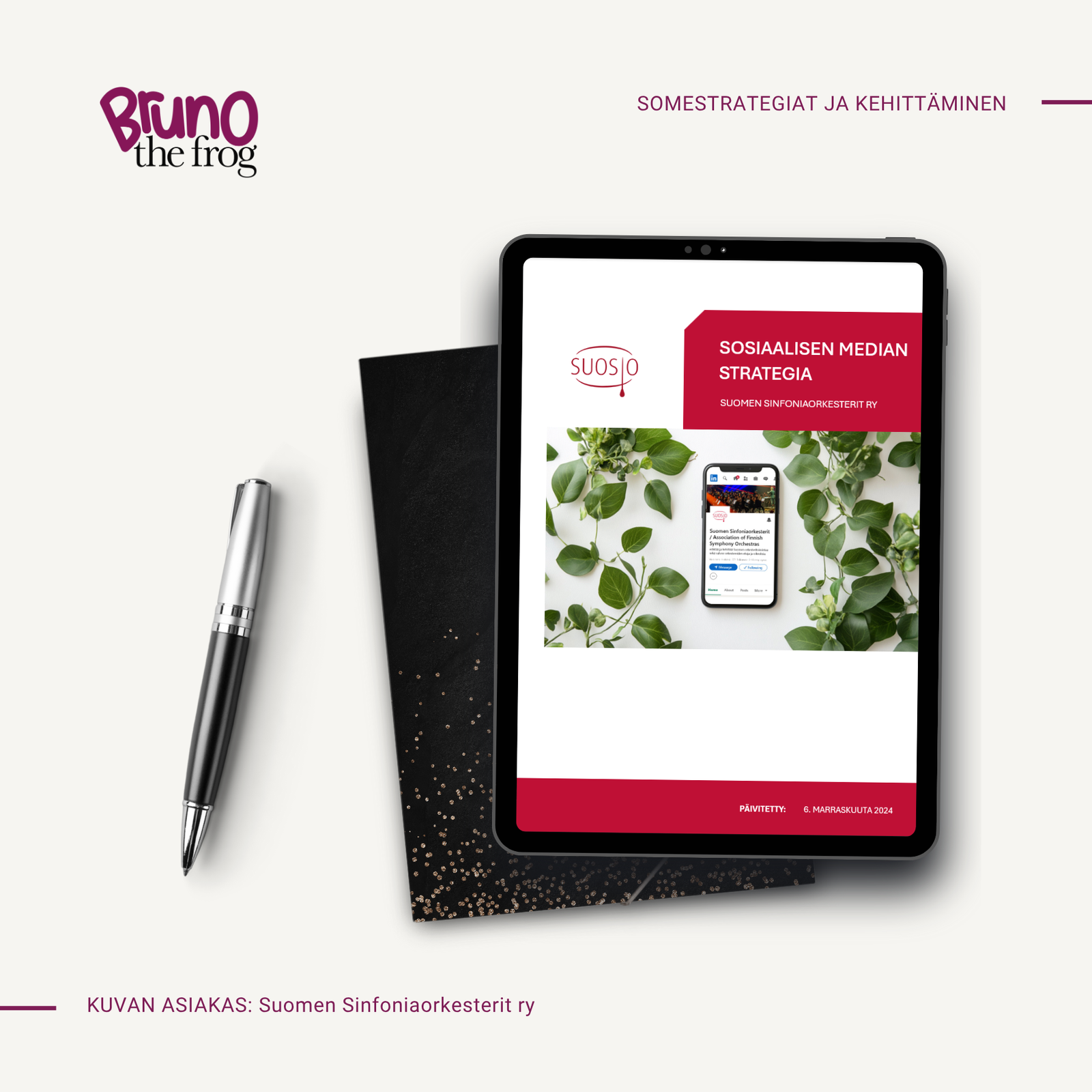 Teimme SUOSIOlle kattavan sosiaalisen median auditoinnin, jonka pohjalta suunnittelimme heille tavoitteet ja kohderyhmät huomioon ottavan sosiaalisen median strategian. Autoimme SUOSIOta kirkastamaan, miksi he käyttävät sosiaalista mediaa ja millä keinoilla he voisivat saada somesta entistä parempia tuloksia. Tämän lisäksi teimme SUOSIOlle kampanjasuunnitelman 60-vuotisen taipaleen juhlakampanjalle.